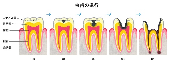虫歯には進行度合いにより下記の5つのステージに分けられます。