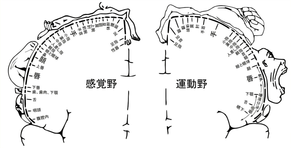 これによると唇・舌などの口腔器官や手の感覚の領域の広さが他の体の部位よりも大きいことがわかります。